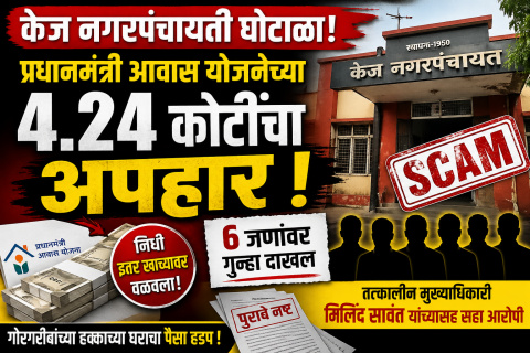 बीड — केज नगरपंचायतीमध्ये प्रधानमंत्री आवास योजनेच्या निधीत तब्बल 4 कोटी 24 लाख 73 हजार 23 रुपयांचा मोठा अपहार झाल्याचे उघडकीस आले आहे. गोरगरिबांच्या हक्काच्या घरांसाठी आलेला निधी लाभार्थ्यांच्या खात्यांऐवजी इतर खात्यांवर वळवून शासनाची फसवणूक करण्यात आल्याचा गंभीर आरोप आहे.