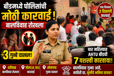 बीड — जिल्ह्यात बालविवाहाच्या घटनांवर पोलिसांनी मोठी कारवाई करत एका दिवसात दोन ठिकाणी छापे टाकून बालविवाह थांबवला असून, एकूण तीन गुन्हे दाखल करण्यात आले आहेत. अनैतिक मानवी वाहतूक प्रतिबंध कक्ष (AHTU) च्या पथकाने ही धडक कारवाई केली.