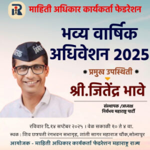 बीड — माहिती अधिकार कार्यकर्ता महासंघ (फेडरेशन) ही महाराष्ट्रातील ही जागरूक नागरीकांची व माहिती अधिकार कार्यकर्त्यांची सर्वात मोठी संघटना असुन महासंघाचे राज्यव्यापी अधिवेशन दि.१४ सप्टेंबर २०२५ रोजी सकाळी १० वाजतापासुन ते सायंकाळी ४ पर्यंत शिव छत्रपती रंगभवन ,शांतीसागर महाराज चौक ,सोलापुर येथे आयोजित केले आहे.या अधिवेशनासाठी राज्याच्या ३५ जिल्ह्यातुन सुमारे पाचशेच्या वर कार्यकर्ते उपस्थित राहतील असा विश्वास माहिती आधिकार कार्यकर्ता महासंघ फेडरेशनचे संस्थापक अध्यक्ष सुभाष बसवेकर यांनी व्यक्त केला आहे. या अधिवेशनात मोठ्या संख्येने सहभागी व्हावे असे आवाहन मुख्य प्रचार प्रमुख बीड जिल्हा माहिती अधिकारी कार्यकर्ता महासंघ चे डॉ.गणेश ढवळे लिंबागणेशकर यांनी केले आहे.